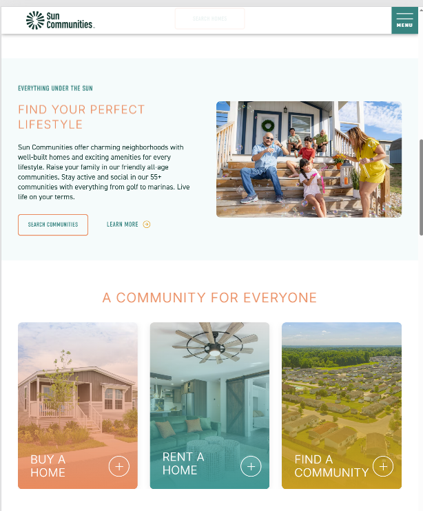 Refreshed and rebranded the website design, user experience, and content to establish Sun Communities as the leader in manufactured housing. Elevate the digital experience with a new 2,500+ page website promoting the all-age and 55+ MH communities and homes for sale and rent in the US and Canada. This stunning, user-friendly site has an intent-driven design and content that energized the brand and increased organic traffic, customer engagement, and home sales.